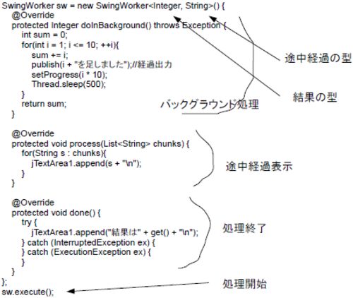 EventQueue#invokeLaterなどを使えということなのですが、実際の処理をいちいちinvokeLaterすると処理の記述が分断して大変みにくくなります。記述の美しさよりも処理の安全さ、とはいえ、これはあんまり。 ということで、Java SE 6からはSwingWorkerという…