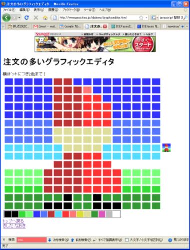 jQueryを勉強中。 やっぱ最初に作るのはグラフィックエディタだろJKということで、ドット絵エディタを作ってみた。 ただ作っても面白くないので、使えるのは16色まで、しかも横8ドットにつき2色までという、知ってる人は知ってる制約を付け加えてみました。 …
